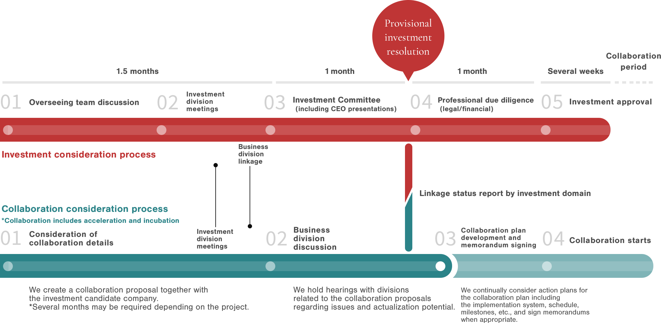A lead-in period of three to four months is generally necessary before starting to execute on an investment. Together with the general venture capital investment consideration process, we also consider collaboration (including acceleration and incubation) plans.